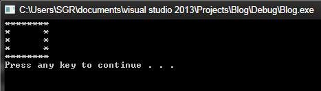 Now only one thing is left, that is first line of shape and last line of shape should be intact, that is it should be printed normally, filled with characters because we want to cover all sides of shape with characters and just empty inside of the shape. Just enhance above if condition a little bit and we are good to go like this: